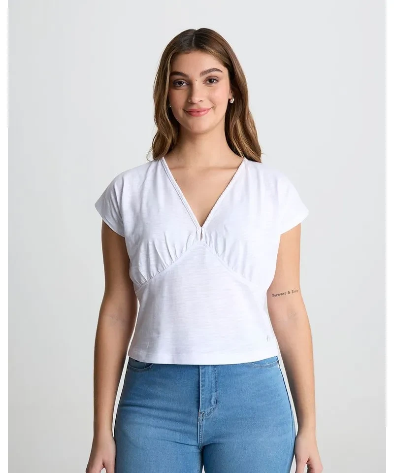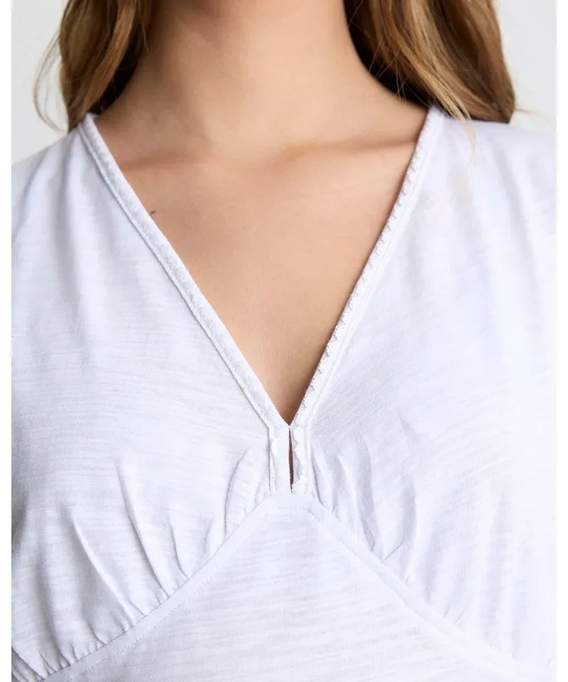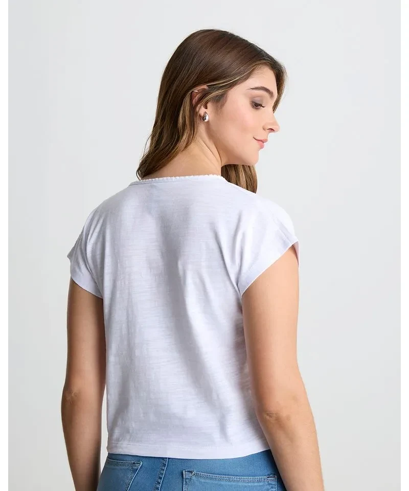 Remera escote en ve con puntilla angosta superpuesta y sisa caída en jersey flamé de algodón.