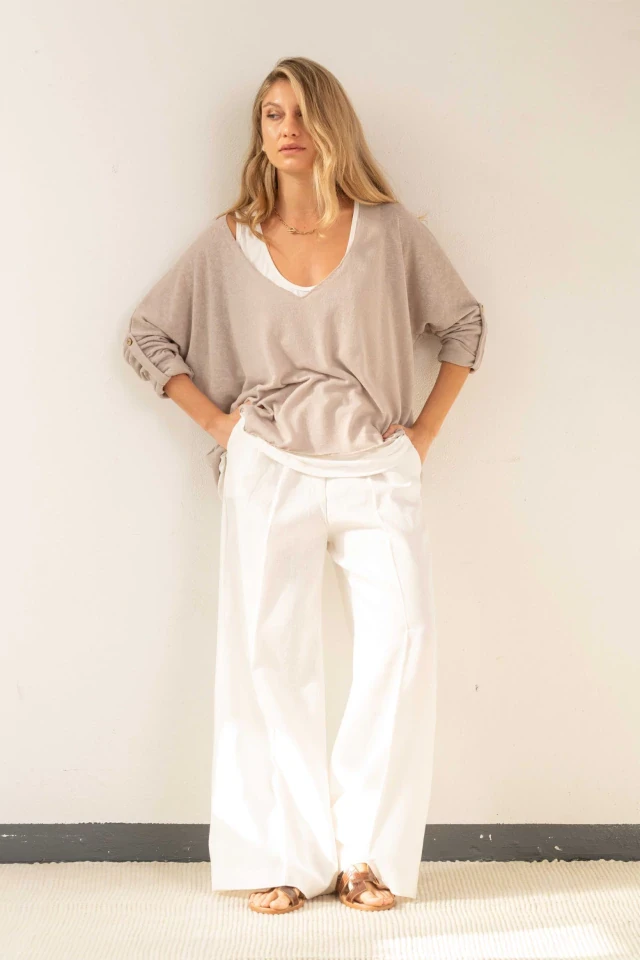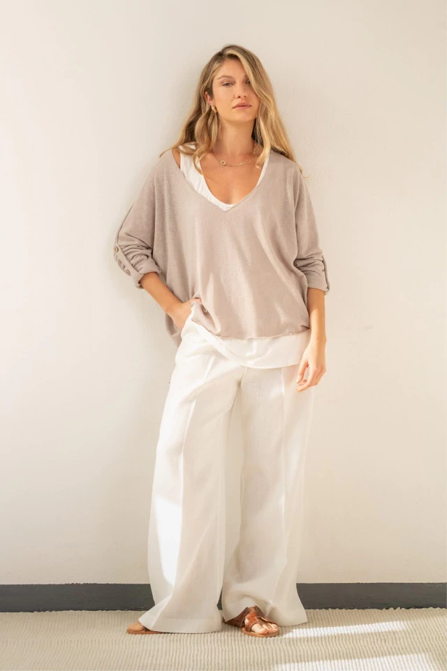 Incluye una musculosa larga de viscosa y un sweater liviano de lino con botones de coco natural